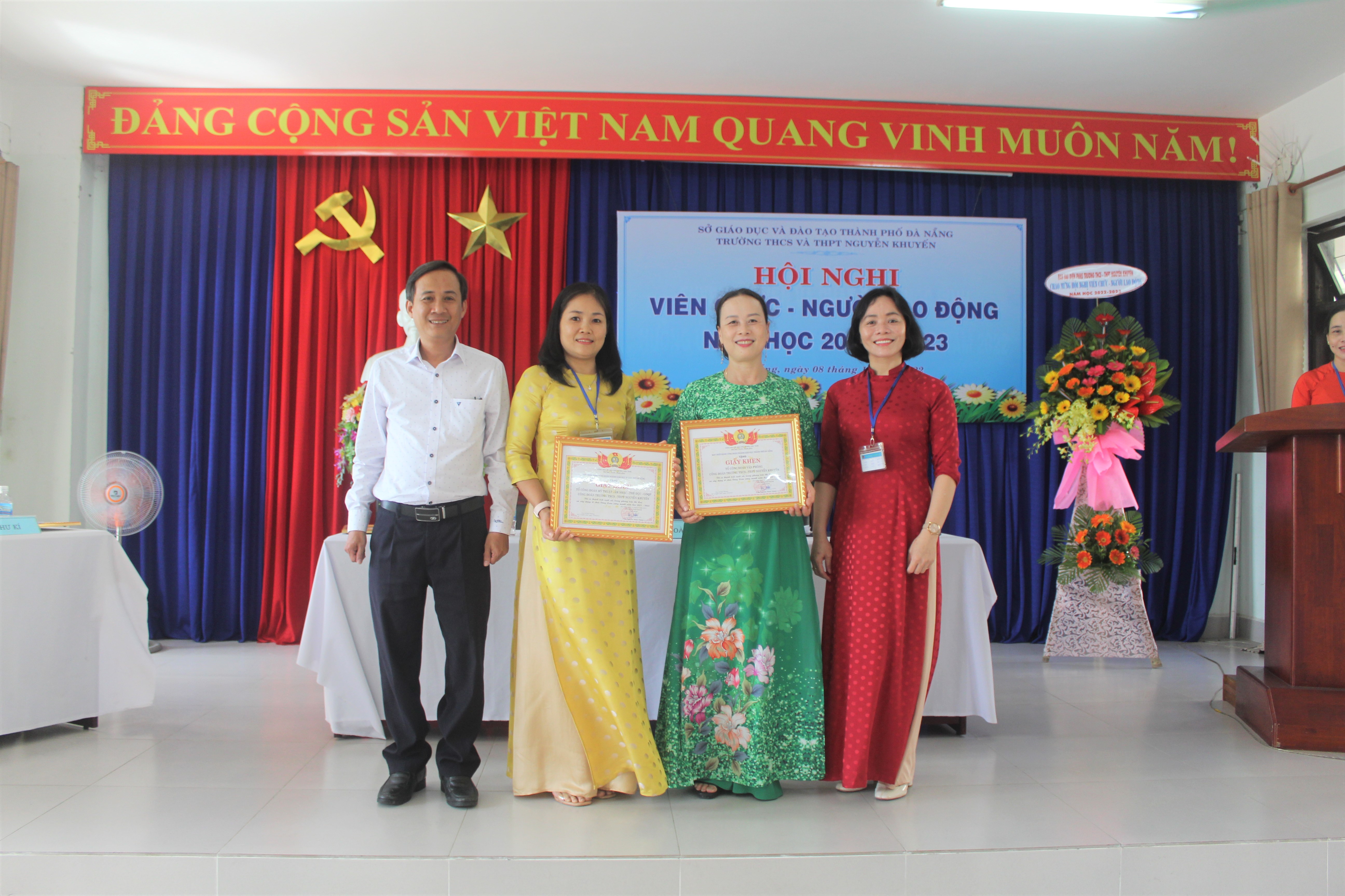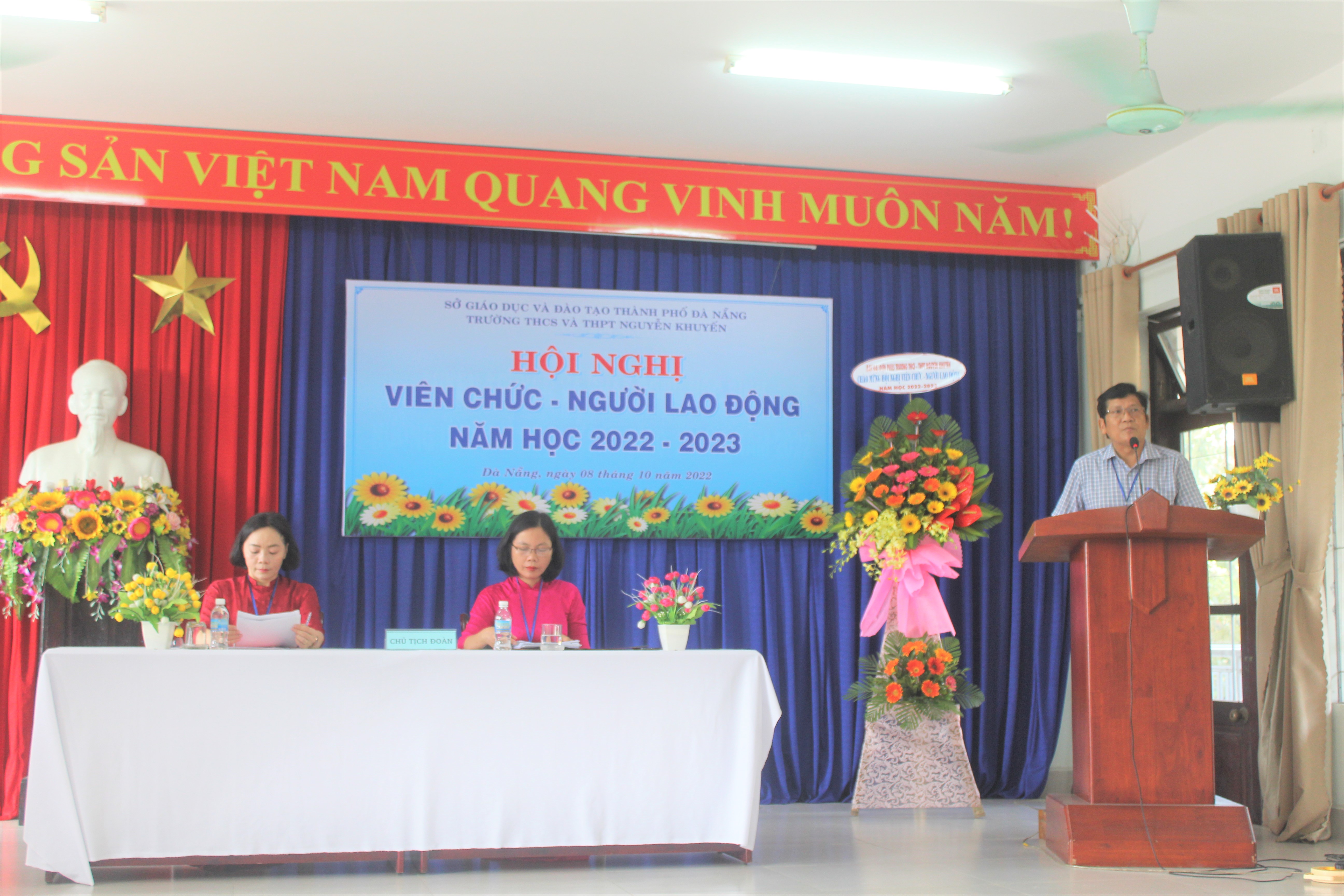 Hôm nay, ngày 08 tháng 10 năm 2022, Trường THCS & THPT Nguyễn Khuyến tổ chức Hội nghị Viên chức-Người lao động năm học 2022-2023. Về dự với Hội nghị có Ông Võ Thái Dương, Chuyên viên Phòng GDTrH, Sở GD và Đào tạo Đà Nẵng cùng toàn thể giáo viên, nhân viên nhà trường cũng có mặt đông đủ. Sau một buổi sáng làm việc khẩn trương, nghiêm túc; Hội nghị đã đánh giá công tác dạy – học năm học 2021-2022, đồng thời đề ra các nhiệm vụ, giải pháp và chỉ tiêu năm học 2022-2023.