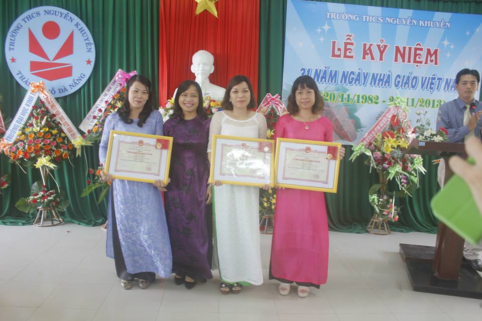 Kỷ niệm ngày Nhà giáo Việt Nam năm nay, hòa chung trong không khí của phong thi đua dạy và học của ngành, cô Hiệu trưởng đã vui mừng báo cáo kết quả thi đua năm học 2012-2013 Trường THCS Nguyễn Khuyến, Đà Nẵng được Bộ Giáo dục và Đào tạo tặng Bằng Khen cùng nhiều phần thưởng cao quý khác.Thật là niềm vinh dự lớn cho nhà trường!